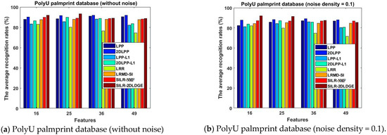 For continuous corrosion experiments, we randomly added a density of 0.1 of “salt & pepper” noise to the Yale, AR, and PolyU databases. Then, we ran a set of experiments and compared them with seven methods to evaluate the proposed SILR-2DLDGE algorithm. Figure 7, Figure 8 and Figure 9 show the average recognition rates (%) of different dimension changes on the three different databases.