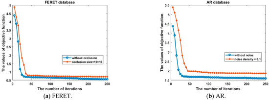 In the last experiment, we will further prove the convergence of the SILR-2DLDGE algorithm on the FERET and AR databases, respectively. The objective function values decreased monotonically; Figure 10 shows that the proposed algorithms are convergent due to the increase in the number of iterations.