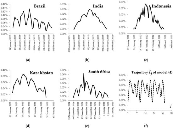 Infected proportion of the population and modeled 7-period morbidity trajectory of (a) Brazil, (b) India, (c) Indonesia, (d) Kazakhstan, (e) and South Africa, (f) trajectory Ij of model (4) (developed by authors).
