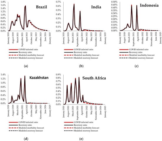 Modeled forecasts of the dynamics of morbidity and recovery in (a) Brazil, (b) India, (c) Indonesia, (d) Kazakhstan, and (e) South Africa (developed by authors).