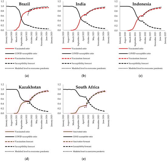 Modeled forecast of vaccination dynamics in (a) Brazil, (b) India, (c) Indonesia, (d) Kazakhstan, and (e) South Africa (developed by authors).