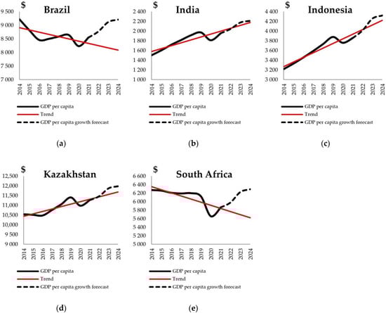 Modeled GDP per capita growth forecast in (a) Brazil, (b) India, (c) Indonesia, (d) Kazakhstan, and (e) South Africa (developed by authors).