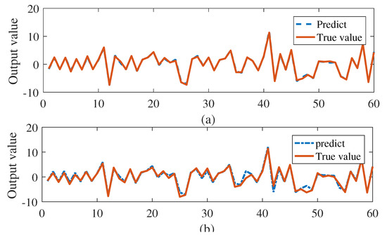 Model (36) is the general form of (37). and are the degree of the output and input; and is the given memory order of the output and input; is the weight vector; and is the functions vector. Taking the NARX model (36) as an example, we set that , , , . This yields and, thus, . Since , only 4 of the 28 linked weights are non-zero. In our study, we use k = 1000 samples for learning with white Gaussian noise. The last 60 in generated data sequence is selected for testing and the predicting result is compared with the true value. The estimated parameter w agrees with the true value as shown in Figure 3. The predicting performance of Algorithm 1 is shown in the Figure 4. From the Figure 4, the predicted and exact trajectories match well with different . When Algorithm 1 is executed 8 times, the average of the RMSE of output are 0.021 and 0.074, which are tolerable in the application.