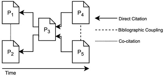 The methodology of bibliographic coupling was developed by Kessler [11] from MIT. It is a simple, yet effective technique for mapping relationships between publications. This approach looks at the co-occurrence of citations between two papers and can be used to identify knowledge communities. The idea behind this method is that if two publications concurrently cite at least one reference, they are likely to be related. If more citations are shared, the likelihood increases. However, a shortcoming of bibliographic coupling is that its relationships contained within each publication can only exist up to the date of issuance. To complement this methodology, Small [12] proposed the co-citation analysis method. This is an extension of bibliometric coupling, where two publications are co-cited if they are independently cited concurrently by other publications. Co-citation analysis is more powerful than bibliographic coupling because it can identify relationships between publications that have not been explicitly cited concurrently. These two techniques are often used in combination to map the evolution of research trends. A brief diagram of these two techniques is shown in Figure 1.