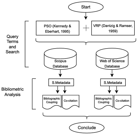 The structure of this search can be seen in Figure 2. The two databases that were selected for this bibliometric study were the Web of Science and Scopus databases, which are widely recognized for their academic journal literature. These two databases were queried for publications related to PSO, VRP, and their various variants from the year 2000 to 2022, so that the publication history would be long enough to examine some of the research trends in PSO and VRP. Lastly, a bibliometric study was carried out using the VOSViewer visualization software (van Eck et al. [13]) and the Bibliometrix R software package (Aria et al. [14]) through bibliographic coupling and co-citation analyses. These metadata analyses helped to identify the most relevant publications, topics, and trends.