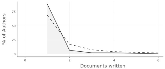 Author productivity (gray) compared with Lotka’s Law (dashed); percentage of authors against number of publications.
