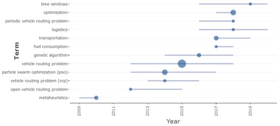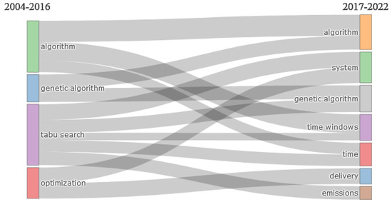 The Web of Science thematic evolution figure shows a narrower scope of results; however, it also shows insights that are not as noticeable in its Scopus counterpart. This is likely because the vehicle routing problem with time windows (VRPTW) is a classic variant of the VRP and has been frequently studied in the literature. Furthermore, the terms delivery and emission emerged as new keywords in the same time period. This is due to the increasing importance of sustainability and “green” issues in logistics and transportation. To verify these trend possibilities, bibliometric analysis was carried out.