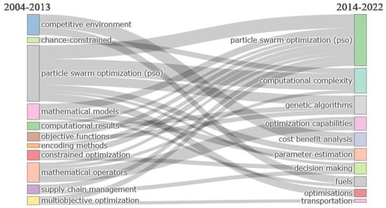 From this figure, it can be seen that both changes in the distributions of keywords, along with the keywords themselves, have changed between 2004–2013 and 2014–2022. Computational complexity emerged as a new theme in 2014–2022, as newer approaches harnessing higher computing power to solving the vehicle routing problem are investigated. Similarly, research interest has shown a shift from exact-method mathematical models towards optimization capabilities, genetic algorithms, and cost-benefit tradeoffs. This change is likely in response to the emergence of more powerful PSO solution strategies that can approximate VRP solutions with reasonable accuracy. Therefore, the most recent VRP and PSO research have been increasingly focused on developing effective metaheuristics and hybrid strategies.