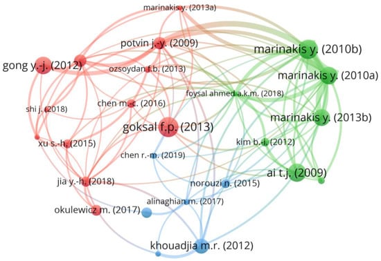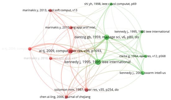 In order to retrospectively confirm the key reference structure of PSO/VRP research, a co-citation analysis was performed on the Scopus database. The results of this analysis are shown in Figure 11.