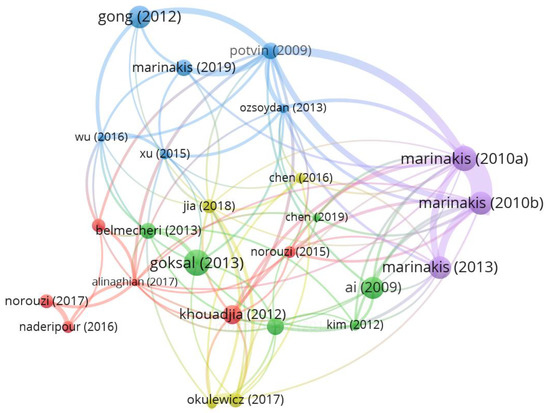 Despite its smaller size, the thematic centricity and formatting of the Web of Science database might also be more conducive to bibliometric analysis; for example, the essential concept of PSO inertia weight introduced by Shi and Eberhart [60] entered into the top co-cited papers for the Web of Science database, but was not present in the Scopus database, either due to citation formatting differences or the co-citations of other publications. The work of by Kennedy and Eberhart [15] and Dantzig and Ramzer [3] once again appear to form the green right cluster, but another distinct source by Clarke and Wright [59], who described vehicle scheduling from a central depot, also appears in this cluster. Similarly, the research by Marinakis et al. [7,30,31], Ai and Kachitvichyanukul [22], and Solomon [47] also reappear in the left red cluster. One additional distinct source by Chen et al. [43], who dealt with hybridizing PSO with simulated annealing to escape local optima, is found (Figure 13).