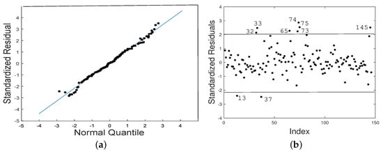 QQ plot for standardized residuals (a) and plot of index values versus standardized residuals (b) for the indicated model.