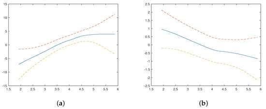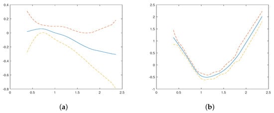 over all functions in this set, with the subscript p denoting the penalty of the function , a being a non-negative definite matrix, and . The first term on the right side of Equation (2) measures the goodness of fit, whereas the second term penalizes the roughness of each with a fixed parameter . In this case, the estimation of leads to a natural cubic spline with knots at points , that is, it is a piecewise polynomial of degree 3 in each interval ; see Green and Silverman [23]. It should be noted that the choice of , known in the literature as the smoothing parameters, is crucial in the estimation process, as they control the tradeoff between goodness of fit and the smoothness (regularity) estimated function. A more extensive discussion on the methods of selecting such parameters is presented later.