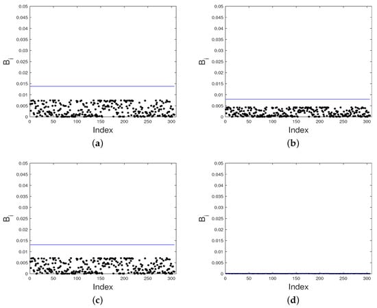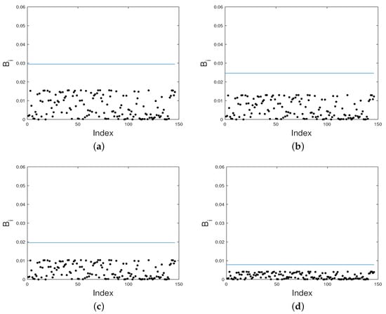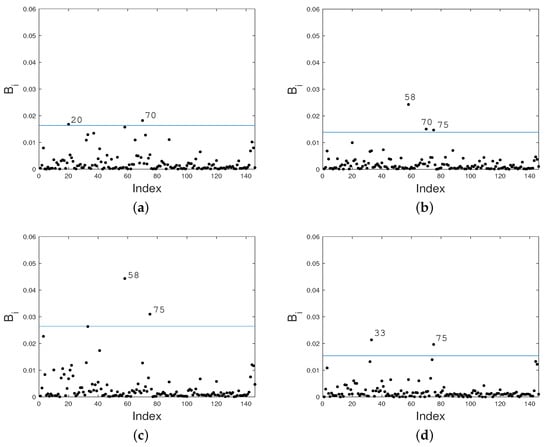 In Figure 15a, the observations highlighted as influential under case-weight perturbation for correspond to the observations , which were registered on 14 April 2018, 18 April 2018, 25 April 2018, 28 April 2018, and 29 May 2018, while in Figure 15b, the observations highlighted as influential in correspond to the observations , which were registered on 17 April 2017, 29 April 2017, and 30 April 2017. In Figure 15c, the observations highlighted as influential in correspond to the observations {29, 30}, which were registered on 29 April 2017 and 30 April 2017. In Figure 15d, the observations highlighted as influential in correspond to the observations {51, 54, 160, 165}, which were registered on 21 May 2017, 24 May 2017, 07 April 2018, and 12 April 2018.