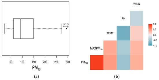 Boxplot for PM levels recorded by the HCH monitoring station in Lima, Peru. (a) Boxplot for PM10 levels recorded by the HCH monitoring station in Lima, Peru, during 2017–2018 and (b) scatter plot with the corresponding correlations for the indicated explanatory variables and response variable.