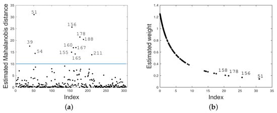 Figure 14 displays index plots of the Mahanalobis distance under Student- PVCM (Figure 14a), while Figure 14b shows the estimated weights of Student- PVCM. In these figures, we can see possible outliers and/or influential values under the already-adjusted model. In Figure 14a, {39, 51, 54, 155, 156, 160, 165, 167, 178, 188, 211} cases are highlighted as possible outliers. In Figure 14b, we can observe that the estimated weights for the observations described above take the smallest values, confirming the robust aspects of MPLEs against outlier observations under Student- PVCM. With respect to the values detected in Figure 14a, these correspond to the days 9 May 2017, 21 May 2017, 24 May 2017, 2 April 2018, 3 April 2018, 7 April 2018, 12 April 2018, 14 April 2018, 25 April 2018, 5 May 2018, and 28 May 2018, respectively.