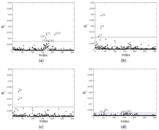 Now, we analyze how the estimators behave when the explanatory variable MAXPM is modified. In Figure 16a–d, no observations are highlighted as influential for , , , or .