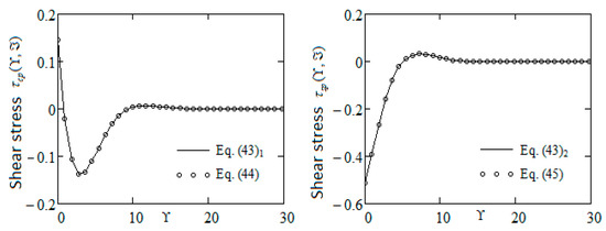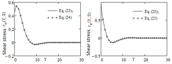 Consequently, the result is that the expressions of the dimensionless steady-state shear stresses and given by the relations (23)1, (24), respectively (23)2, (25) can be obtained solving the dimensionless differential Equation (30) with the boundary conditions