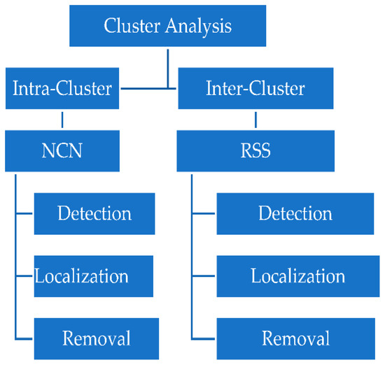 The clusters are monitored through detection and localization method to identify and remove the spoofing attack. The cluster is further divided into intra-cluster and inter-cluster. In the former approach, the communication between the two or more clusters is possible and in the later approach the communication within the cluster is used. RSS and NCN techniques are suggested for the detection of spoofing attacks. RSS is used for inter-cluster, where the spoofing attack is detected, localized and eliminated from the different clusters. On the other hand, NCN is used to detect, localize and eliminate the spoofing attack within the cluster, as shown in Figure 1.