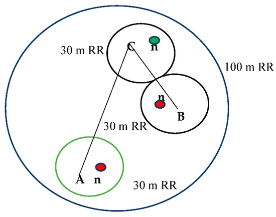In this paper, the RSS-based correlation is inhibited by wireless infrastructure to execute detection using a spoofing attack from the surrounding wireless devices in a cluster-based approach. Detection of spoofing attacks is simple and accurate through RSS because cryptography is avoided. Likewise, using RSS to detect spoofing does not need any extra modification or cost in the existing wireless devices. Through RSS reading, the location and cluster of the spoofing attack could be identified by measuring the distance. In RSS, reading in term of distance are different because different nodes are operating from different locations/clusters at the same time. As shown in Figure 2, the network is divided into three clusters (K = 3) and each cluster has its core node, i.e., A, B and C. The green node shows a legitimate user and the red nodes show a spoofing attack. In a spoofing attack, the legitimate user and the attacker are sharing the mixed reading and will not be able to detect the spoofing attack. To detect the spoofing attack, cluster-based analysis is used to find the distance between the two cores and to find the physical presence of a spoofing attack in a specific cluster. It is assumed that at t1 a core will communicate once with a node n. Let us suppose that core C is having a maximum radio range of 100 m and a minimum of 30 m. In normal conditions, the core will operate in a radio range of 100 m. The core node records and saves the time and distance of a valid user. At the same time, the two spoofing attacks in clusters B and A also communicate with core C within a 100-m range from different clusters. Therefore, at the same time, the core node is communicating with three different nodes and therefore the distance will increase from 100 m to 300 m because each time core C communicates with each node in the different cluster and increases the distance. Now core C receives the information from the same ID but with a larger distance and shows the presence of spoofing attacks.
