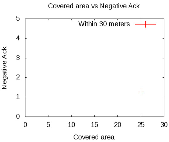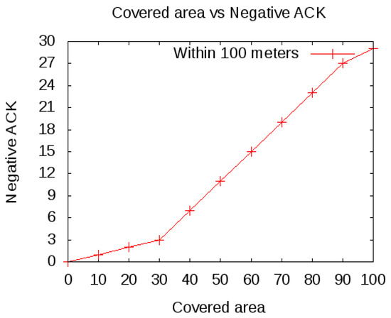 Now, scenario 2 is used after the detection and identification of the spoofing attack, where the radio range of each cluster is up to 30 m. As a result, spoofing nodes in the other clusters are not entertained and only the node within the clusters is entertained from the communication. This decreases the negative ACK because nodes within the cluster are with less distance and hence packet drop decreases and a successful communication is increasing between the source and the destination. As shown in Figure 6, only one negative ACK appeared, which is normal within a mobile environment.