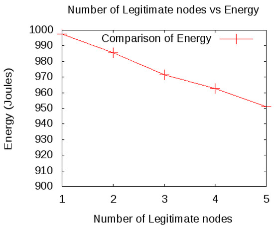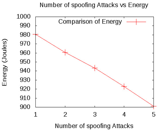 In this section, two scenarios evaluate the network performance in the presence and absence of a spoofing attack. Figure 8 shows the simulation under the normal conditions, i.e., in the absence of a spoofing attack. It shows that the energy is consumed in a normal rate and hence the lifetime of the cluster increases. The Figure 8 shows that in the presence of five legitimate nodes, 46 joules of the energy are consumed. On the other hand, in the presence of a spoofing attack, 80 joules of energy are consumed, and with the increase in spoofing attack the energy consumption increases, as shown in Figure 9.