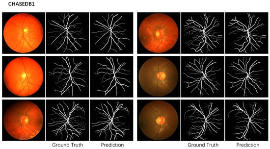 For the CHASEDB1 dataset, we also perform Shapiro–Wilk test to verify distribution normality. For our UNet backbone, the p for ACC, AUC, Spe, Sen, and MIOU are 0.18, 0.72, 0.75, 0.40, and 0.70, respectively. For the proposed network, the p for ACC, AUC, Spe, Sen, and MIOU are 0.36, 0.70, 0.31, 0.71, and 0.43, respectively. The result of the multiscale structure also satisfies the distribution normality. The p for ACC, AUC, Spe, Sen, and MIOU are 0.84, 0.64, 0.76, 0.84, and 0.49, respectively. We also conduct a paired sample T-Test and calculate Cohen’s d to evaluate the significance of the performance improvement. The entire network significantly improves the our UNet backbone in terms of Acc, AUC, Sen, Spe, and MIOU by 0.0107 (), 0.0420 (), 0.3323 (), 0.0054 (), and 0.2318 (), respectively. The effect size for Acc, AUC, Sen, and Spe are 2.01, 3.44, 5.71, 1.1, and 3.74, respectively. The multiscale input improves the performance of baseline U-Net in terms of Acc, AUC, Sen, Spe, and MIOU by 0.0105 (), 0.0408 (), 0.3316 (), 0.0054 (), and 0.2276 (), respectively. The corresponding effect size for Acc, AUC, Sen, Spe, and MIOU are 2.09, 3.35, 5.56, 1.30, and 3.74, respectively. The attention module significantly improves the performance compared to the multiscale architecture in terms of AUC, Sen, and MIOU by 0.0012 (), 0.007 (), and 0.0042 () with effect size 0.5, 0.3, and 1.8, respectively. The attention module slightly improves ACC and Spe compared to the multiscale architecture.