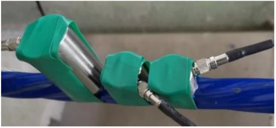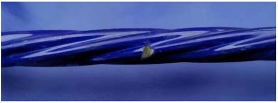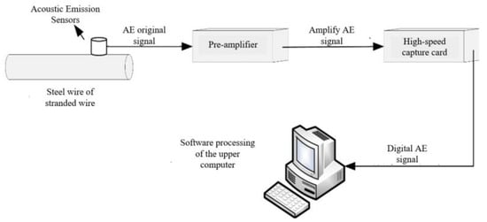 The current health monitoring of bridges is mostly based on overall monitoring. This method is mainly based on the monitoring of bridge service environment, operational loads, and structural response data to achieve bridge structural conditions and safety performance []. However, compared with the overall condition, monitoring local structures such as cables and suspenders is also important for bridge operation and maintenance. Therefore, the local damage monitoring methods should be introduced in conjunction with overall bridge monitoring techniques. Acoustic emission (AE), as a non-destructive testing technique [], can be applied. This technique can record the signals generated by the target acoustic emission process in real time with deploying sensors to the target for data acquisition. By applying it to bridge cable monitoring, only a small number of sensors are required to achieve efficient detection of the broken wires, thus effectively assessing the damage level of bridge cables. Researchers in the field of acoustic emission monitoring have conducted numerous studies based on different types of cable damage. Such damage analyses include corrosion of the natural environment in which the bridge is located [,,,], fatigue loading from long-term vehicle passage [,,], and external tensile breaking action [,,,,,,].