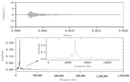 The testbed for the tensile test is shown in Figure 1. The strand selected for the test was the same as bridge cable with single filament epoxy coated pre-stressing strand, i.e., diameter of about 15.24 mm ( strand) and an ultimate tensile strength of 1860 MPa. Three kinds of acoustic emission sensors (WG50, SR150M, and SR40, from www.en.ae-ndt.com (accessed on 15 May 2022) were used to cover the whole frequency range (15 to 1000 KHz) measurement. The available parameters of these sensors are listed in Table 1. The amplification factor of the preamplifier is 20 dB. In real circumstances, bridge cables may break at random locations. In the experiment, we therefore prefabricated a notch on the steel strand to set the cable break position. We used an electric wheel saw to cut out a single wire with a depth of 2 mm prefabricated notch as shown in Figure 2. The strand was first arranged in the reaction frame, and the acoustic emission sensor was deployed on the surface of the strand as shown in Figure 3. One end of the reaction frame was fixed with pre-stressing clamps and anchorages. The other end was tensioned at a uniform rate by a jack. The tensioning process of the strand continues until wires are broken (see Figure 4). Starting from the pulling force reaching 60% of the ultimate tensile strength, the acoustic emission sensor captures the acoustic emission signals in real time and transmits it to the high-speed acquisition card of a computer. As the upper frequency bound of acoustic emission sensors is 1 MHz, the sampling clock rate used in the high-speed acquisition card is 3 MHz to ensure all details of the acoustic emission signals can be captured. Two channels are used for simultaneous acquisition. Figure 5 shows the block diagram of the steel strand acoustic emission monitoring system. Figure 6 shows the working interface of computer acquisition software. From the measurement results, the frequency range of typical broken wire signals is 0~300 kHz with peak point spectrum range of 40~60 kHz, i.e., see Figure 7. The frequency range of typical non-broken wire signals is 0~200 kHz with peak point spectrum range of 44~65 kHz, i.e., see Figure 8.