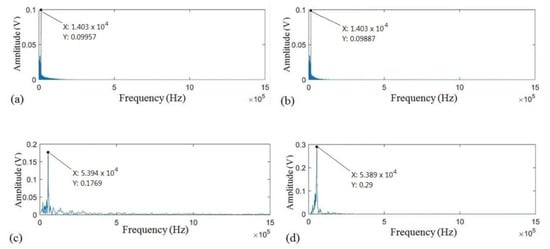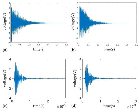 Comparison between simulated signals and measured signals (type 2). (a) Simulated broken wire signal, (b) Broken wire signal, (c) Simulated non-broken wire signal, (d) Non-broken wire signal.