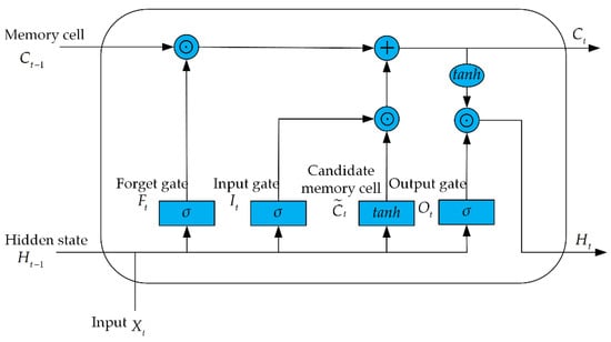 LSTM is an artificial neural network often used in the fields of artificial intelligence and deep learning []. It is a chain structure containing a large number of repetitive neural network modules, three gates (input, forgetting, and output gates), and the same memory cells as the hidden state. The internal structure of a LSTM cell is shown in Figure 12.
