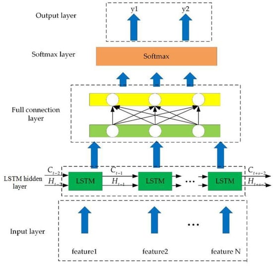 The structure of the LSTM model built in this paper is shown in Figure 13. For the previously extracted acoustic emission signal features, the main role of the input layer is to import the feature vector of each acoustic emission signal into the LSTM network. The LSTM hidden layer is responsible for further analysis of the feature vector of the input batch samples and passing the valuable information to the fully connected layer, which is mainly responsible for converting the dimension of the LSTM output vector into the dimension of the model label vector. The fully-connected layer is mainly responsible for converting the dimensionality of the LSTM output vector into the dimensionality of the model label vector, so that the loss function can be calculated. The final Softmax layer is mainly responsible for mapping the category scores’ output from the fully connected layer to a positive range, and then normalizing them to (0, 1) to obtain the probability of each category. The category to which each acoustic emission signal sample belongs is finally obtained from the output layer.