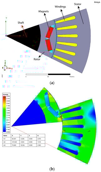 The IPMSM used in the modeling is shown in Figure 1. The analyzed motor has a power of 50 kW and a torque of 400 Nm. Detailed information about the motor is presented in Table 1 [,]. In the designed motor, the oil cooling system is used to prevent the winding temperature from exceeding the specified limit value. Figure 1b shows the magnetic flux density distribution at full load and rated speed. As shown in the figure, the maximum value of the stator tooth average flux density (m1) is 2.07 T, and the end of the rotor flux barrier is 2.58 T. These are oversaturated regions. However, the stator back iron section was found to be 1.51 T on average.