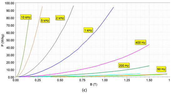 Analyzed motor for the 2D FEM: (a) motor geometry; (b) magnetic flux density distribution; (c) core loss versus frequency for JFE_Steel_35JN300.