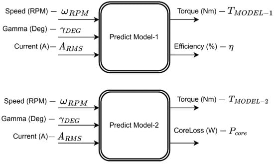 In this study, the machine learning based multivariate polynomial regression model is used for efficiency and core loss estimation. Figure 2 shows the diagram of the proposed two models for efficiency and core loss map estimation. These developed models can estimate efficiency and core loss by training a multivariate polynomial model with the data set. Speed, gamma (current angle), and current are used for the input parameters of each model. Torque and efficiency estimation can be made with Model-1, and torque and core loss estimation can be made with Model-2. It is difficult to create an estimation model because the core loss estimation model requires a complex nonlinear model []. The accuracy of the core loss estimation model is important because of its impact on the design process. For this reason, two separated models have been created to make high accuracy estimations for efficiency and core loss estimations.