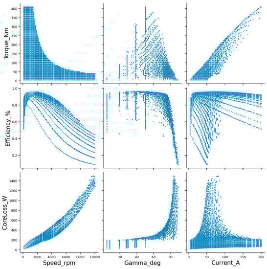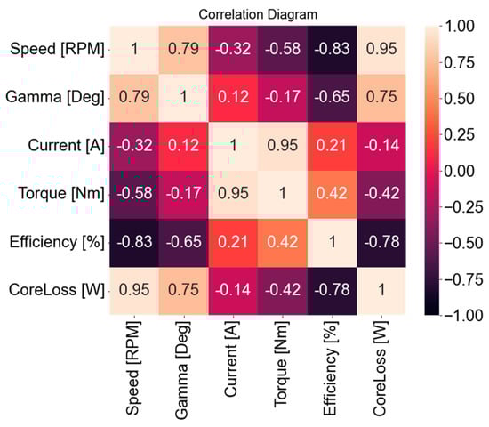 The developed estimation models are trained by using speed, gamma, current, torque, efficiency, and core loss parameters obtained from the previously designed IPMSM FEM. The main reason why multivariate polynomial regression is preferred in the proposed method is that the training parameters used contain nonlinear components. The correlation coefficient is used to examine the relationship between the training parameters. Correlation coefficients indicate the linear relationship between parameters []. The coefficient of correlation measures how much the input variables affect the output variables in data analysis. In Equation (16), the coefficient of correlation () is defined as: the correlation between input variable and output variable .