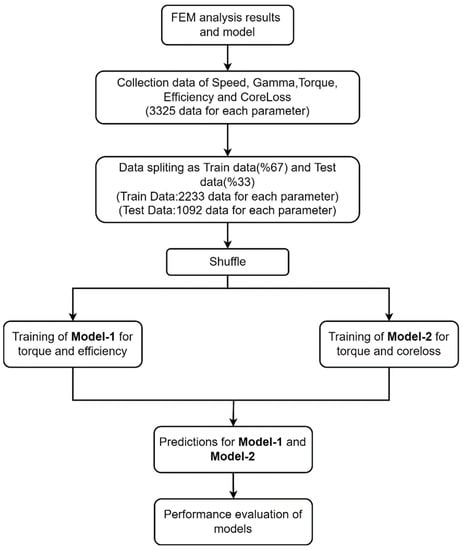Figure 5 shows the flow diagram of the proposed method that expresses the efficiency and core loss estimation process. The data set used for training the developed models is divided into 2 parts. This division is training and test data. The whole data set consists of many “samples” of different speed values. Depending on the values of each Speed_rpm, the data are divided into 67% training and 33% test data. According to this split, 2233 training data and 1092 test data are generated for each parameter. This split value is sufficient to generate Efficiency and core loss maps. This procedure of splitting the data set has a distribution that allows the data to form an accurate prediction model.