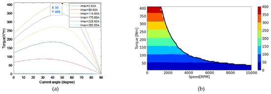 Analyzed motor torque: (a) torque-current angle; (b) torque-speed map.