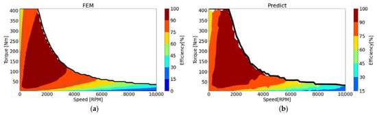 While the current angle at which the maximum torque occurs in surface mounted magnet motors is 0 degrees, for IPMSM this value varies between 0 and 90 degrees depending on the reluctance torque. For these motors, the angle at which the maximum torque occurs must first be determined. In Figure 7a, the torque curve obtained according to the current angle and the maximum value of the applied current are presented. As can be seen, the maximum torque value is 406 Nm at 50 degrees. Another aspect is the constant torque and constant power zones for this motor. In Figure 7b, 0–1194 rpm is the constant moment, and 1194–10,000 rpm is the field weakening area. Figure 8a shows the FEM efficiency map presented as a contour graph. It is seen that the motor maximum efficiency is 96% at speeds close to the corner speed. Figure 8b shows the efficiency map estimation for Model-1 trained with polynomial regression. The estimation result is in good agreement when compared with the FEM results. According to the FEM results, the estimation of the motor maximum speed shows close values.