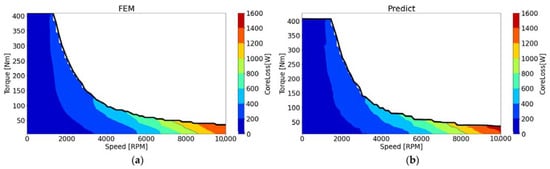 Core loss map FEM and estimation results are given in Figure 9a and b, respectively. According to the results obtained from the FEM analysis, as expected, the highest losses are closest to the maximum speed, that is, the points where the supply frequency is highest. The estimation results of Model-2 trained for core loss are in close resemblance to FEM analysis. The estimation results are of high accuracy comparable to the FEM analysis during the design process.