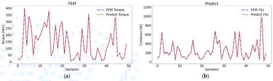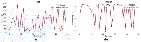 Comparison between FEM and prediction for 50 samples obtained with Model-1: (a) torque; (b) efficiency.
