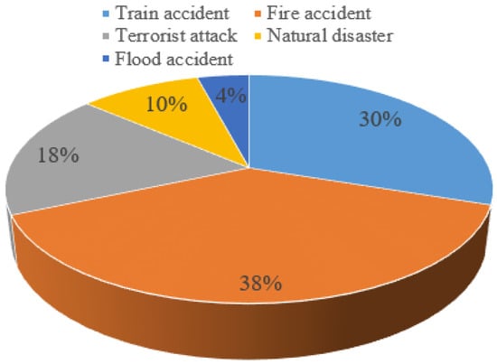 Public emergency is regarded as the cornerstone of national stability and social tranquility. The traffic volume in major cities is growing rapidly. Whether in open areas or in closed places, if the crowd density is very large, public safety accidents are prone to occur, and the consequences are often very serious. Therefore, public safety and emergency evacuation issues have been given high priority. The statistics [1] of different types of subway emergency accidents in recent years are shown in Figure 1.