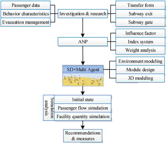 The pedestrian evacuation factors in the subway were analyzed using ANP (analysis network process, a decision-making method that adapts to the hierarchical structure of non-independence) [25,26,27]. The environmental facilities of the station, pedestrian factors, and evacuation management were analyzed to identify the factors that influence subway evacuation. Then, an influencing factor system was developed to calculate the weights of the influencing factors. The research process is shown in Figure 2.