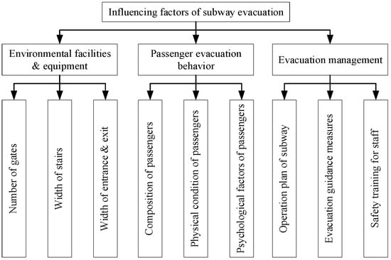 The factors of environmental facilities and equipment, passenger evacuation behavior, and evacuation management were analyzed during the evacuation process. The above factors are divided into three primary indicators and nine secondary indicators. Environmental facilities and equipment indicators include the number of gates, width of stairs, and width of the entrance and exit. Passenger evacuation behavior indicators include the composition of passengers, physical condition of passengers, and psychological factors of passengers. Evacuation management indicators include the operation plan of the subway, evacuation guidance measures, and safety training for staff. The structure of influencing factors is shown in Figure 3.