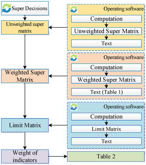 The stability weight of each index was calculated using the special ANP calculation software super decision [37], and the calculation process is shown in Figure 4. The obtained stability weights are shown in Table 2.