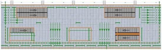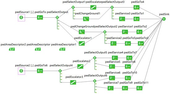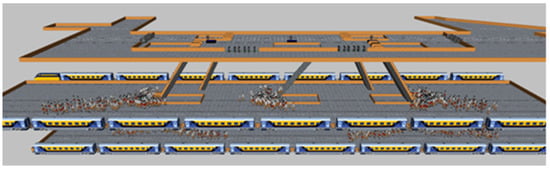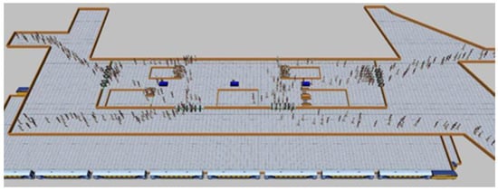 The base map file of the subway platform layer was loaded into the software Anylogic [42]. In order to match the size of the base map with the size in the modeling environment, a scale was used in this step.