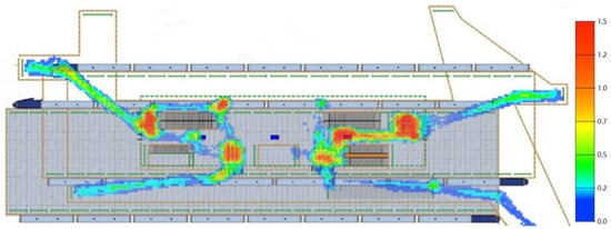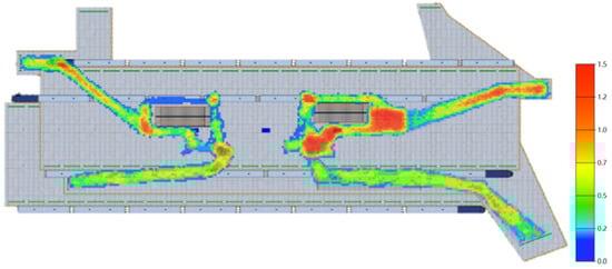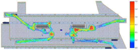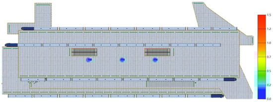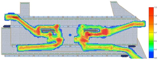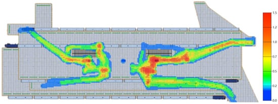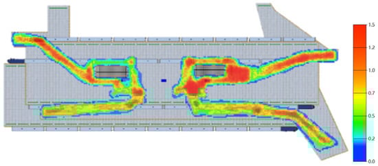 In addition to the personnel ratio structure, the number of gates can affect the evacuation time. Thus, the influence of the number of gates on the evacuation was also studied. Firstly, the number of turnstiles and queues on the left side of the hall floor was changed from five to eight. The total number of turnstiles was 16. From the simulation results, the total evacuation time was 250 s, which is 22 s shorter than the normal time.