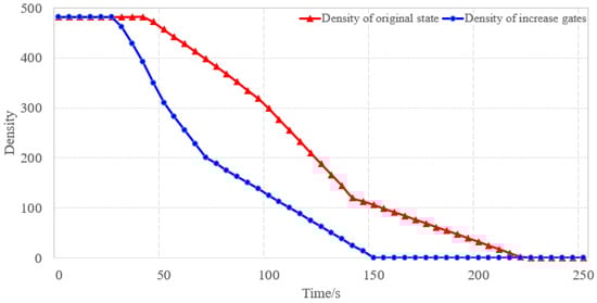 When the number of turnstiles was increased by three, the evacuation time was less than 20 s. When the number of turnstiles was set to the original number of 13, the population density at the hall floor was as shown in Figure 19. After increasing the number of turnstiles, the population density at the hall floor was as shown in Figure 19. By comparing the population densities at different number of turnstiles, we can observe that the population density with 13 turnstiles began to decline gradually at 50 s, while the population density with the increased number of turnstiles showed a clear downward trend at 26 s. In addition, after 150 s, the population density obviously tended to 0, indicating that the evacuated crowds had gradually left the subway station through the turnstiles to the exits on both sides.