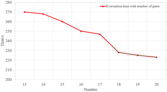 When the number of gates increased to 18 and 20, the evacuation time decreased by 42 s and 47 s, respectively. The evacuation time varied with the number of gates, as shown in Figure 20. There was no large fluctuation in the evacuation time at a later stage. This is because, limited by the moving speed of the crowd and the width of the escalator, although the number of gates increased, the evacuation time of people did not decrease significantly. However, when the number of gates exceeded 20, this resulted in a waste of resources. Therefore, the appropriate number of gates is of great significance for subway management and pedestrian evacuation.