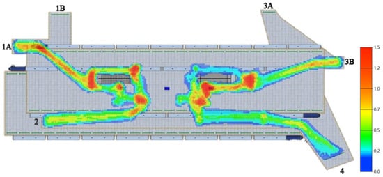 Taking the escalator width, the number of turnstiles and the width of entrances and exits as a combination strategy, the simulation results obtained were as shown in Figure 22. The digitals (1A, 1B, 2, 3A…) in the figure indicate the number of the escape exit.