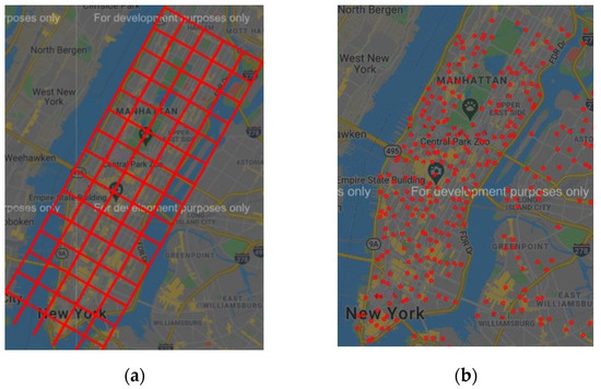 In general, there are two main approaches to processing traffic data, the grid-based approach and the station-based approach. As shown in Figure 1a, the grid-based approach involves dividing the map into a number of grids and then treating the map as an image and then applying a convolutional neural network to the grid. As shown in Figure 1b, the station-based approach is often applied to the predictions of metro and bus passenger flows in a way that intuitively treats bus stops and metro stations as nodes on a map. In the case of taxis, the ability to accurately identify the virtual stations hidden in the traffic data can help us to better understand the characteristics of the traffic data and make the forecasting models more accurate, credible, and relevant than the grid-based approach.
